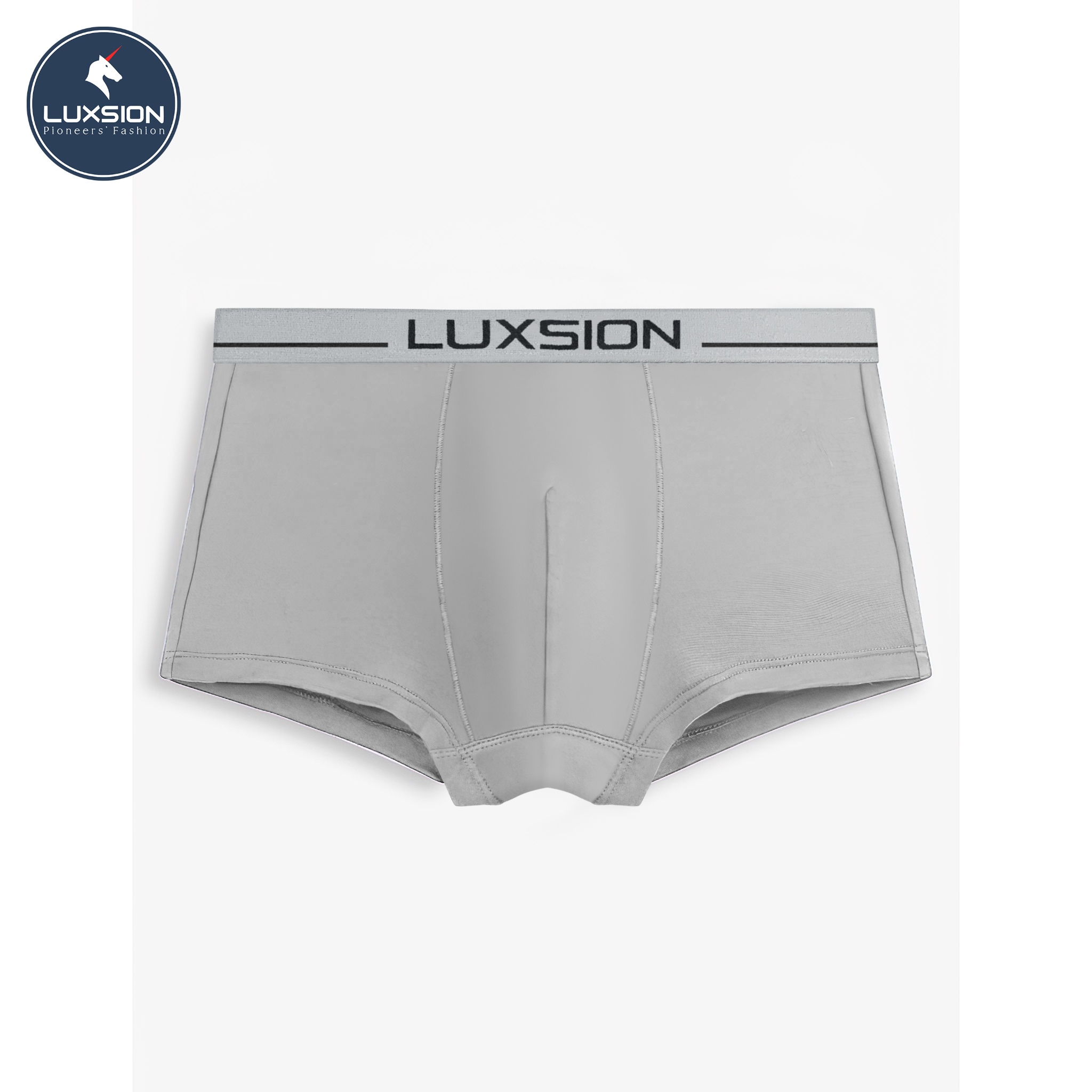 Quần lót nam Boxer Cotton cạp 2.5 Luxsion màu ghi có năm size: M, L, XL, 2XL, 3XL; được may chắc chắn, kết hợp bằng các đường chỉ may phối màu.